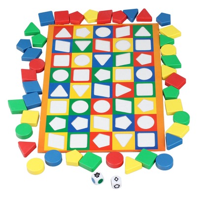 • Com 40 peças geométricas coloridas, um tabuleiro e 2 dados, as crianças jogam combinando formas e cores.